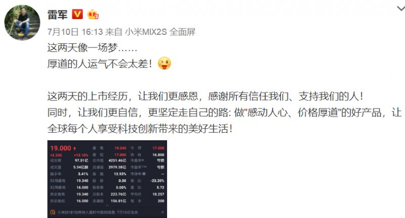 小米上市第二天,股价表现一扫上市首日破发“尴尬”,收盘报收于19港元,较开盘价17港元上涨13.1%,市值为4251亿港元(约541亿美元)。小米创始人、董事长兼CEO雷军发微博称:“这两天像一场梦……厚道的人运气不会太差!”
