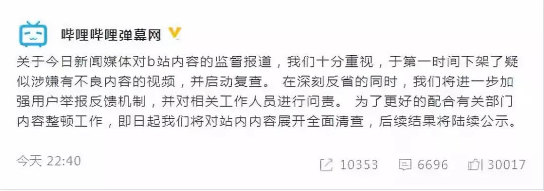 昨晚,B站在微博发表声明回应称已下架涉嫌不良内容的视频,也表示将进一步加强用户举报反馈机制,并对相关工作人员进行问责。