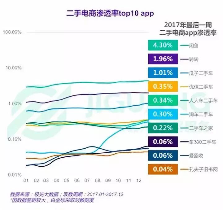 极光大数据统计,2017年度渗透率排名方面,闲鱼以4.30%的渗透率排在首位,转转渗透率为1.96%排名第二位,第三位则是非直接竞争对手的二手车电商瓜子二手车,其他品牌无一超过1%。闲鱼和转转在二手交易综合领域的覆盖地位不可动摇,其中闲鱼呈现压倒性的优势。