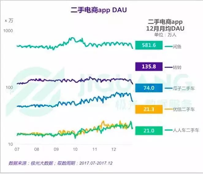 在日活跃用户数方面:也只有排在前两名的闲鱼和转转月均日活达到了百万级别,其中闲鱼月均DAU为581.6万,转转为135.8万。闲鱼与转转之间的差距,似乎是无法逾越的鸿沟,不过这种趋势在2018年有了反转式的发展。