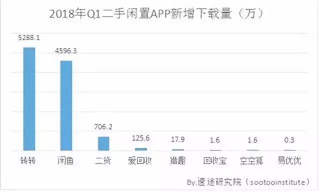 2018年5月,另一机构“速途研究院”发布了“2018年Q1国内二手交易市场研究报告”,分析讨论国内二手交易市场的发展趋势。二手闲置APP2018年第一季度下载量方面,转转为5288万排名第一,闲鱼4596万排在第两位。
