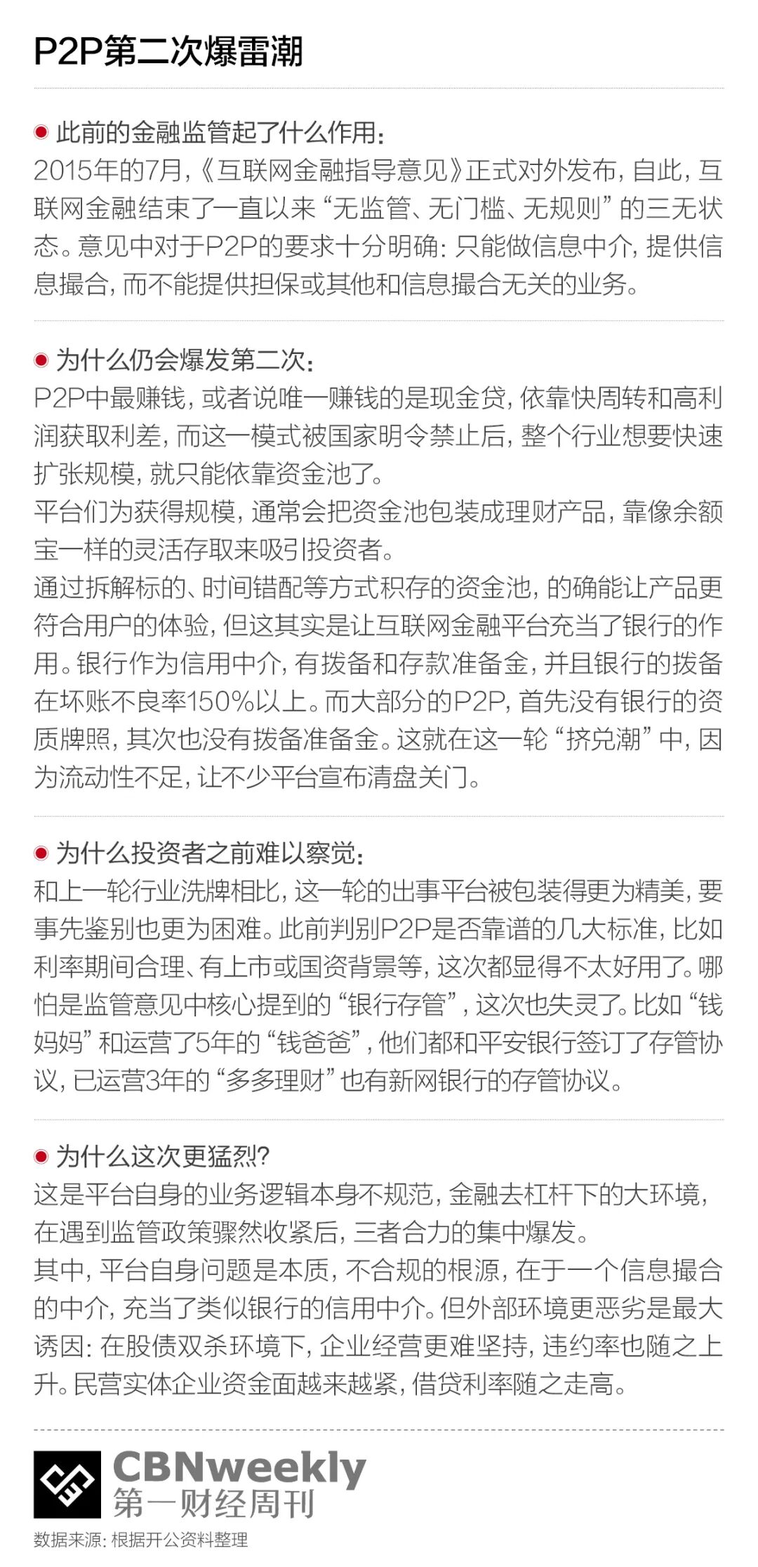 包括平台运营者、接近监管的人士在内的多位采访对象,给出了近乎一致的答案:平台自身的业务逻辑本身不规范,金融去杠杆下的大环境,在遇到监管政策骤然收紧后,三者合力的集中爆发。