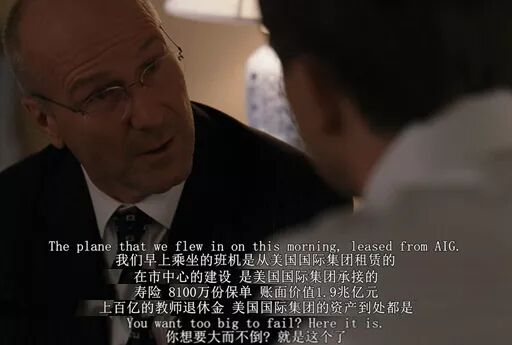 至于AIG为何会走向危机,电影中保尔森的团队,通过接力对话,将其用直白的语言阐述出来,堪称教科书式的普及: