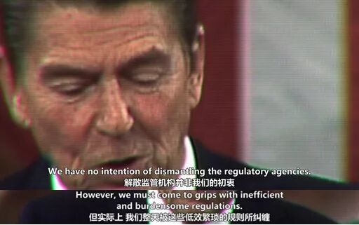 电影《大而不倒》并没有展示金融危机是如何诞生的,但在片头,巧妙地用了几段真实新闻画面,来厘清了危机产生的脉络。首先,电影把美国金融监管的放松,追溯到里根总统时代。