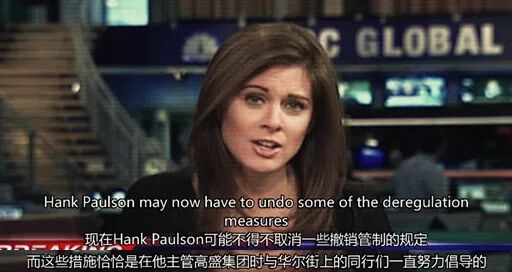 接下来便是新闻媒体关于次贷危机的报道,著名财经主持人如Maria Bartiromo和Erin Burnett等依次亮相。其中美女主播Burnett的这段播报讲出了保尔森面临的尴尬境地:作为财政部长,保尔森要加强监管应对危机,而这些措施,是他在做高盛CEO时极力反对的。屁股决定脑袋。