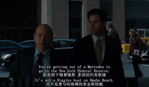电影展现了一个细节,在周日早上,高盛CEO贝兰克梵跟同事走进美联储,同事“我不知道自己还能不能再承受这么一天。”贝兰克梵的回应精彩绝伦:你是从奔驰车上下来,去纽约联储;而不是从希金斯快艇下来,去奥马哈海滩。(注释:奥马哈海滩为诺曼底抢滩登陆的阵地之一,希金斯快艇为运兵船)