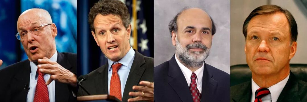 从左至右依次为真实人物的保尔森-盖特纳-伯南克-考克斯