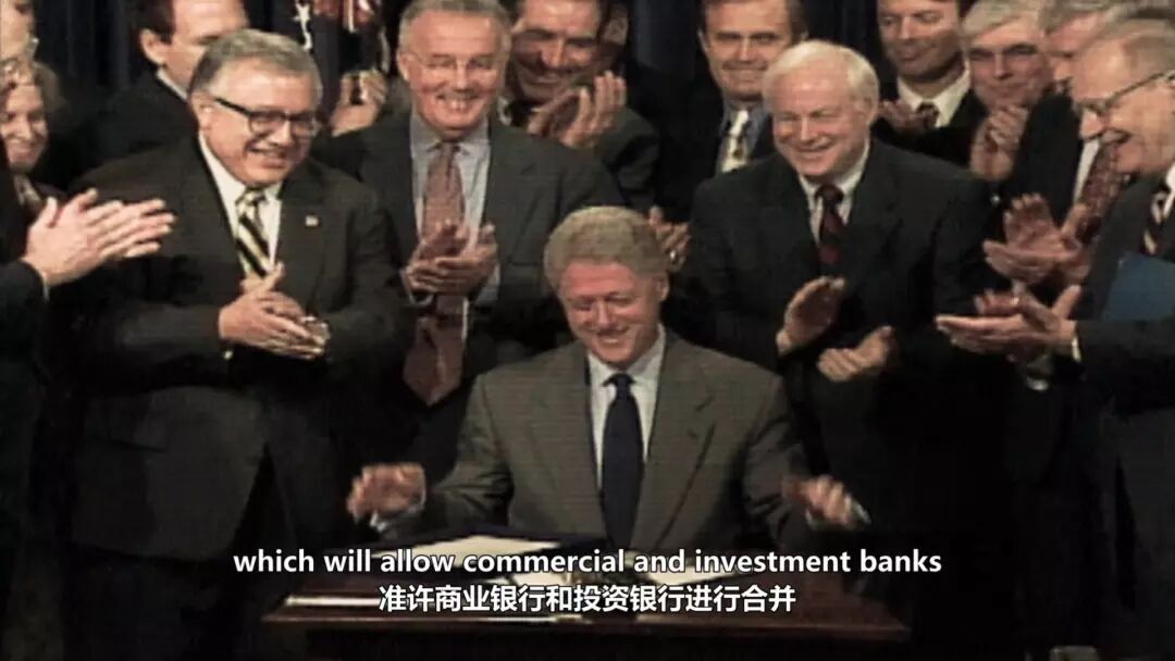 接下来出场的是克林顿总统,画面中展示了他签署《金融服务法现代化法案》(Financial Services Modernization Act )的场景,这条法案推翻了大萧条期间出台的格拉斯-斯蒂格尔法案,允许商业银行从事投资银行业务,最终导致金融机构的“大而不倒”。