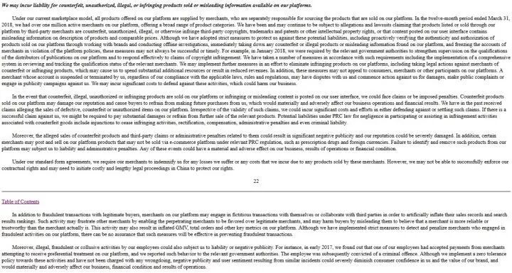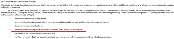 在风险提示(Risk Factor)部分的第一段,阐述整体经营风险时,就提到了「商家在平台上出售商品的质量风险」这一点: