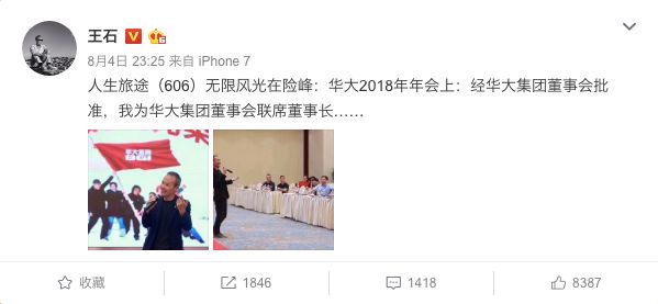 8月4日消息,辞去华大基因独立董事一职后,王石正式宣布出任华大控股联席董事长。王石在朋友圈称,人生旅途无限风光在险峰,华大2018年年会上,经华大集团董事会批准,我为华大集团董事会联席董事长。