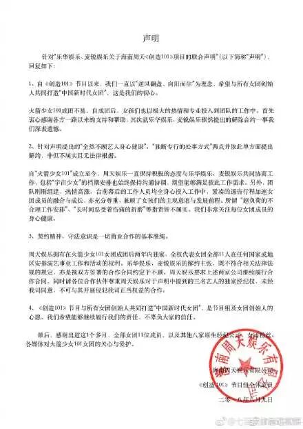36氪讯,乐华娱乐、麦锐娱乐昨日在官方微博发布联合声明称,孟美岐、吴宣仪、张紫宁提前退出火箭少女101团队,原因一方面是艺人工作安排不合理和超负荷,另一方面则是两团并行的问题。乐华娱乐表示,两团并行合同在实际操作过程中未能兼顾,孟美岐、吴宣仪原属组合“宇宙少女”合理行程遭拒绝。