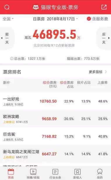 电影市场在七夕档一举拿下4.6亿票房,同比去年的2.3亿,涨幅高达100%,创造档期影史票房新纪录。其中《一出好戏》以破亿成绩成为七夕节单日票房冠军。七部首映影片中,《欧洲攻略》以近亿票房领跑。《新乌龙院》则拿下6600万票房成绩,而《精灵旅社3》和《快把我哥带走》都收获5000万以上的票房。(财联社)