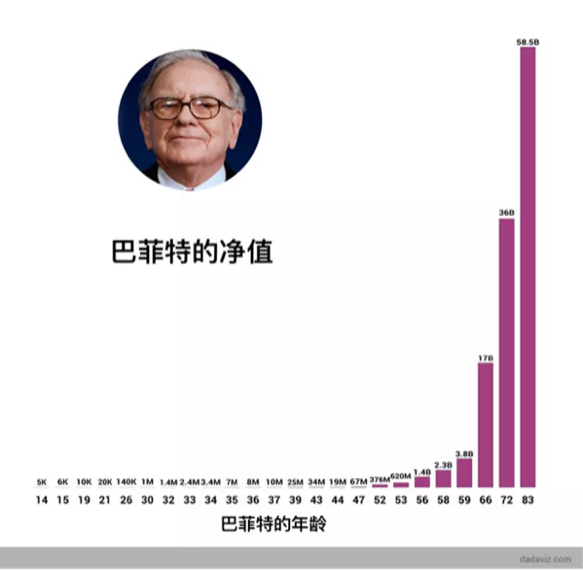 是的,巴菲特全部身价的99.8%,都是在他50岁之后累积的。