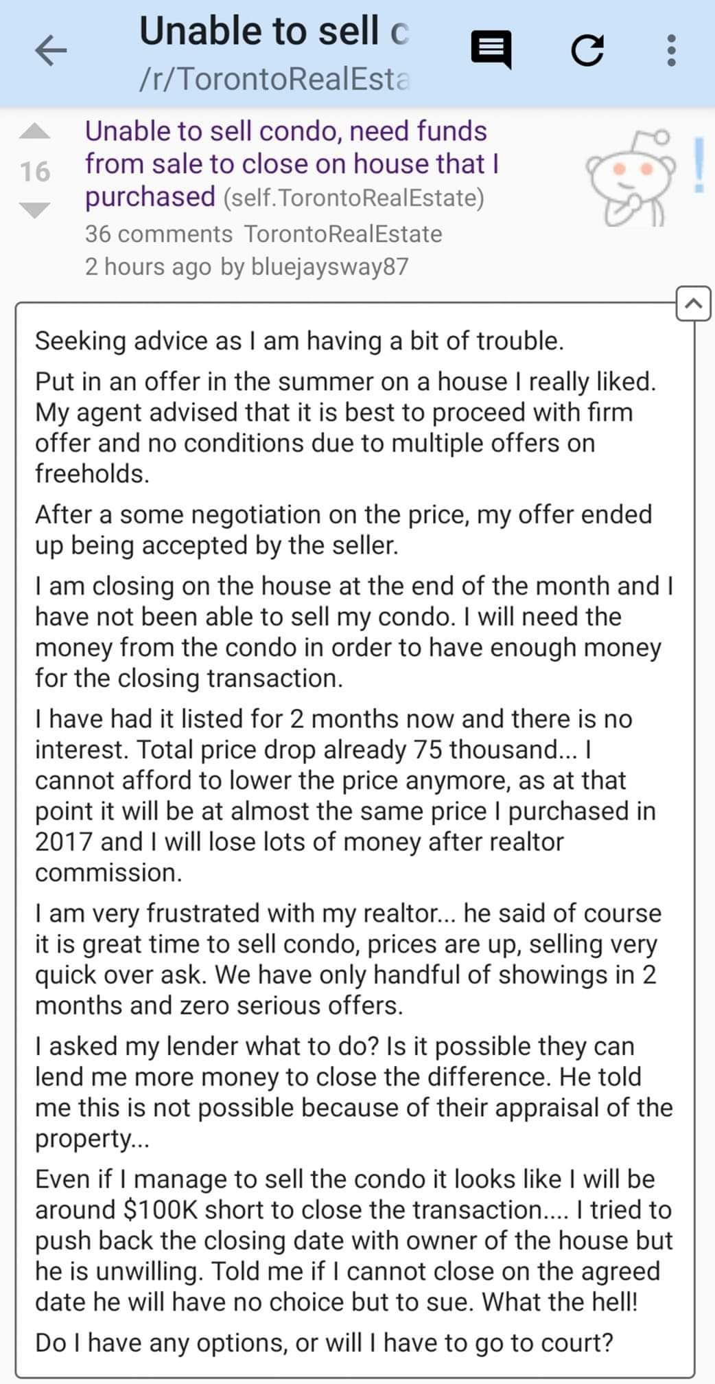 darwin 发表于 2020-10-2 11:04 AM 我也听说一个例子,换房,88w condo降到82w,没人买本来打算降到78w,幸好来个买家接盘了 今后这种情况会 ...