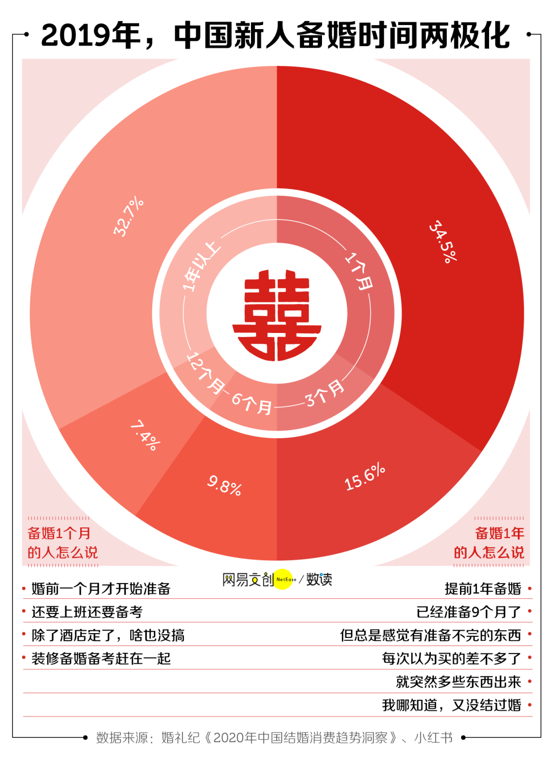 不过,根据调查,并不是所有新人都有那么充足的时间来准备婚礼。虽然有 40.1% 的新人为婚礼筹备了至少一年,但还有 34.5% 的人只用了 1 个月时间准备,分化严重。