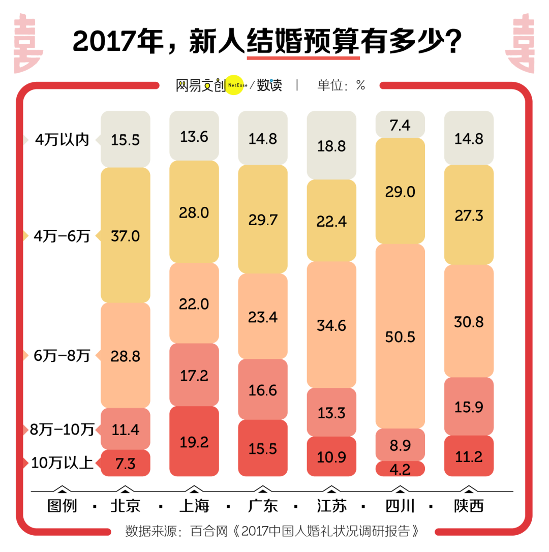 2017 年的时候,婚恋网站百合网发布过一份《中国人婚礼状况调研报告》,调查了六个省份的新人婚礼预算。