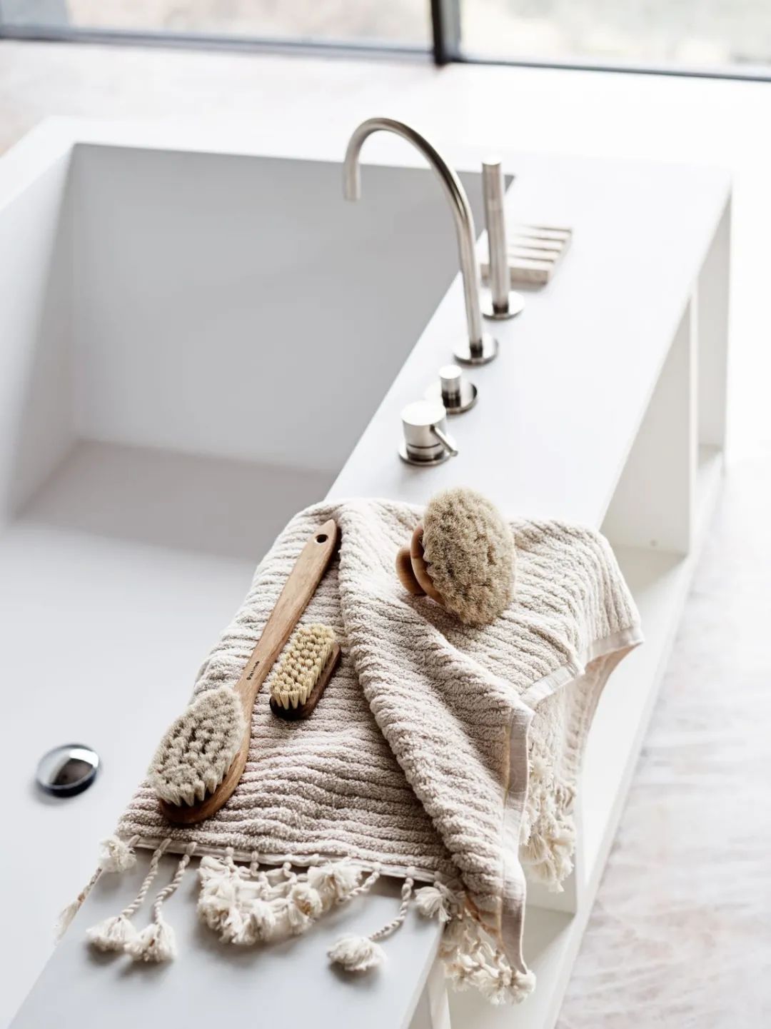 浴室旁的凳子在网格墙的映衬下,极具艺术感。