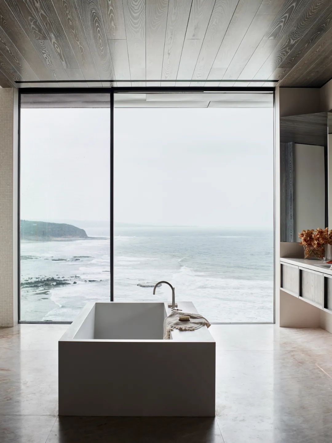 Rob Mills一直擅长设计浴室空间,在这间豪宅中也不例外。主浴室位于豪华套房内部,宽大玻璃窗让住户完全拥抱景观。浴室地面铺设Cristallo石英岩瓷砖,并隐约带有红锈色,营造出静谧氛围。