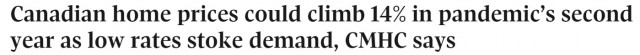 据加拿大《环球邮报》报道,联邦房屋规管机构加拿大按揭及房屋公司(CMHC)在刚刚发布的年度展望报告(Housing Marking Outlook)中预测,今年房屋销售可能达到602,300套,同比增长9%;平均价格则可能从2020年的$567,699加元涨到今年的$649,400加元,涨幅14%左右。