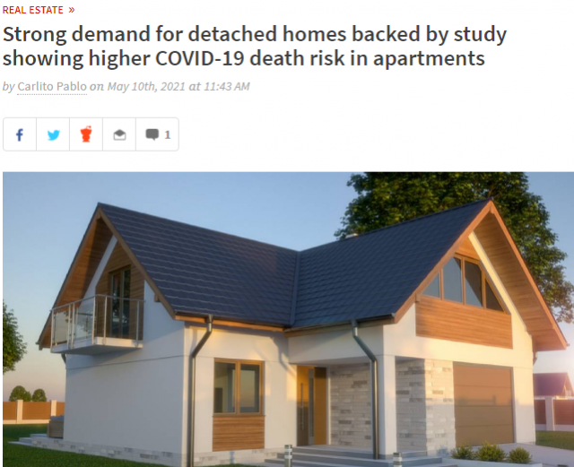 加拿大统计局近期公布一项调查,显示新冠病毒第一波流行期间,居住在公寓内的加拿大人的新冠死亡率,比独立屋内居民的死亡率高出2倍。这一调查结果也许解释了为什么在大流行期间,独立屋会有如此强劲的需求。