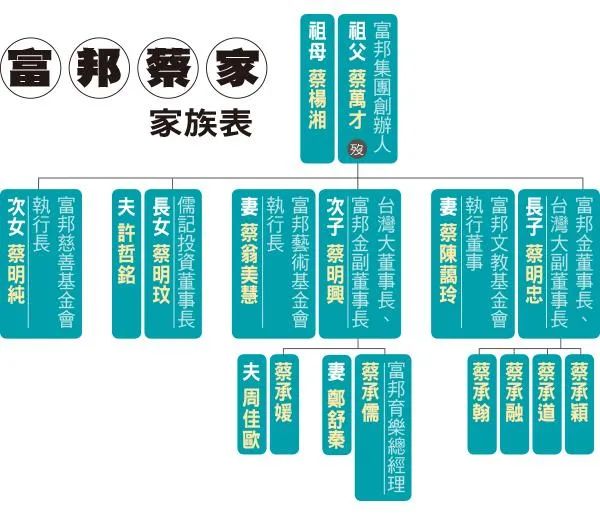 蔡家一代排行老四的蔡万才在分家时仅拿到最小块的国泰产物保险,却靠着有勇有谋成功逆势翻盘,缔造了富邦帝国。他有两个儿子,长子蔡明忠,次子蔡明兴,分别被外界叫做“大董”、“二董”,在最新福布斯富豪榜上的身家是79亿美金(全台第三)。由于蔡明兴结婚生子都早于哥哥蔡明忠,他的长子蔡承儒自然成为了富邦蔡家第三代里第一位进入大众视野的接班人:▲ 14年初,他首次出现在集团尾牙活动上,被媒体镜头捕捉到,看起来温文儒雅。