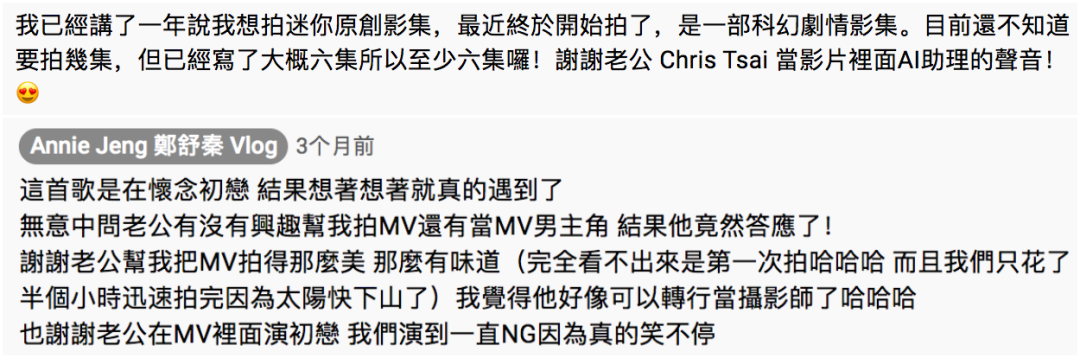 她自2018年开设了油管频道,大多数发布的都是自编自弹的音乐、自导自演的MV,还有各种琐碎日常分享。她的频道没有名牌加持,没有华服珠宝,没有充斥着上流社会的傲慢与偏见,更像是朋友在耳边喃喃细语诉说着一点点心事,仿佛打开了一个得以窥探豪门生活的窗口,让大众看得津津有味。今天就让我们来聊聊这个豪门媳妇,并且透过她的镜头近距离了解下富邦蔡家这样级别的豪门到底过着怎样的生活。