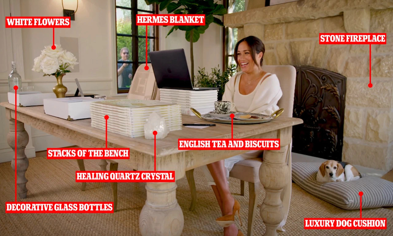 视频中,梅根还曝光了价值1500万美元豪宅的内景,看起来每个摆设都有精心设计的嫌疑,比如爱马仕毯子、英国瓷杯、新书《长凳》来垫电脑,也很是抢镜。