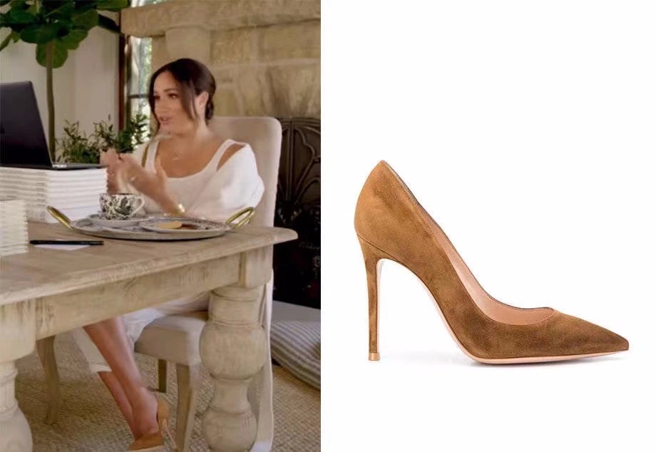 梅根这次的出镜Look,看样子也是精心搭配了,她身着一身白色连衣裙,即便在家也穿着恨天高,品牌来自Gianvito Rossi。