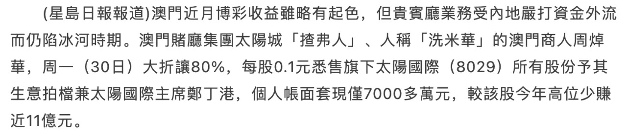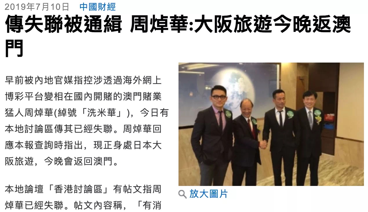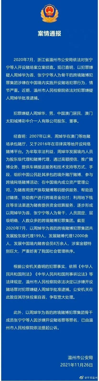 微博@平安温州发布通报,澳门娱乐大亨、太阳城博彩中介一人有限公司股东、董事周焯华,因为涉嫌开设赌场罪而由温州市人民检察院依法批准逮捕,公安机关敦促其尽快投案自首,争取宽大处理。