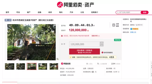 阿里拍卖平台上,位于杭州西湖边的老别墅——玉泉路1号房产(即蔡元培女儿蔡威廉的故居)的拍卖落槌,1人报名,最终以起拍价1.2亿元成交
