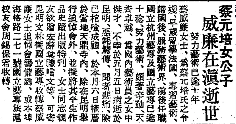 “近两月来,友人来函中,偶有述及报载威廉不幸之消息者,我于阅报时留意,竟未之见,而文铮来函,均为威廉附笔请安,疑诸友人所述之报误也。日内阅昆明寄来之《益世报》二十六日有女画家蔡威廉昨开追悼会新闻,二十七日有女画家遗作展览新闻,于是知我威廉果已不在人世矣,哀哉!亟以告养友(指蔡威廉继母周养浩)始知养友早已得此恶消息,且已电汇法币四百予文铮充丧用,饮泣数夜,但恐我伤心,相约秘不让我知耳。……威廉曾产四女一男,自沅陵迁昆明后,又产一女。不数日,竟以产后疾溘逝,哀哉!”