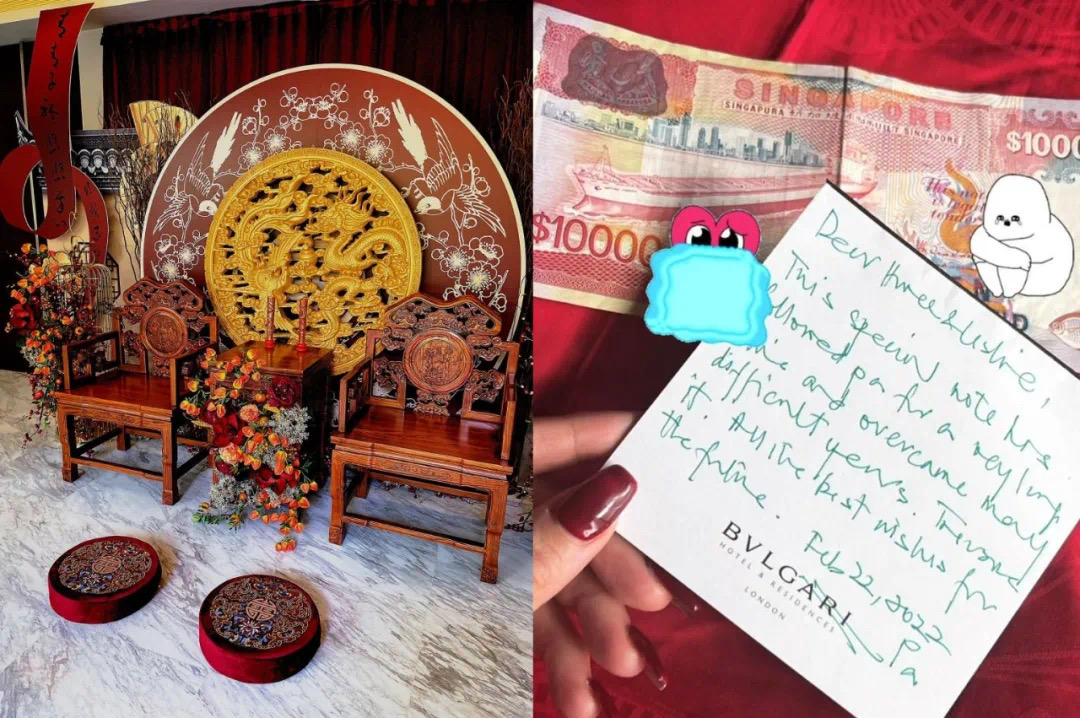 敬茶仪式现场也很有中国味,“老泰山”林荣福给女儿女婿送了红包,红包里是一张已经停止发行的旧版1万新元纸币,还附上一张字条:“这张特别的钞票跟随爸爸很多年,也陪我度过了艰难的岁月。好好地珍惜它,祝你们生活美满”,还蛮温馨的。