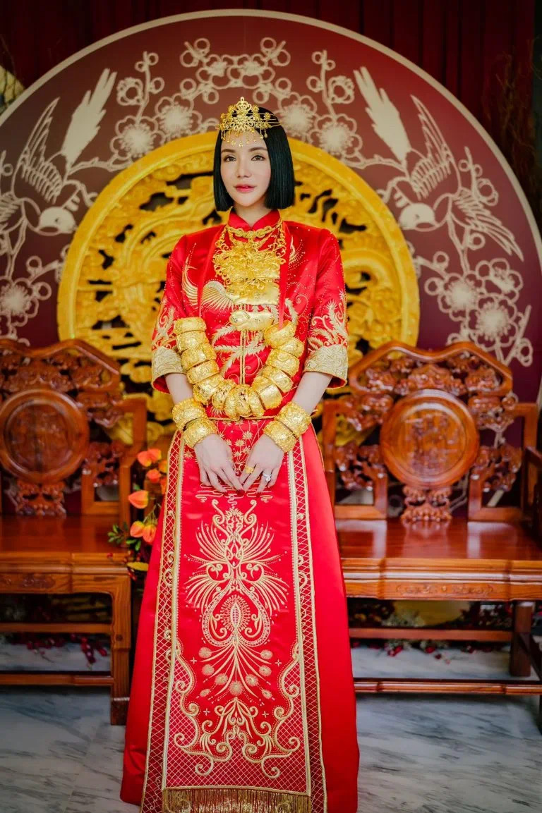 林慧俐这次穿了传统大红五福龙凤褂,戴上巨型金项链和7对龙凤镯,头上一顶小金冠,俨然小公举。
