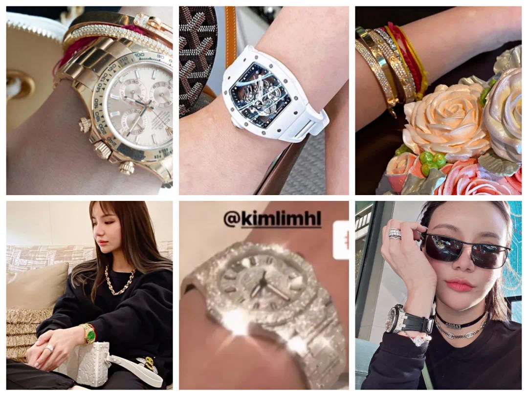 晒起珠宝名表也毫不含糊,大金劳、RM、满钻鹦鹉螺,满钻手镯一戴好几个,满屏的珠光宝气↓