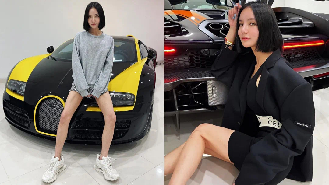 要么就露出大长腿来个豪车配美人,青春活力的造型和超跑很搭~左边这辆专属定制的Bugatti Veyron Grand Sport Vitesse,全球独一无二,进气格栅上有激光切割的英文字母“PL”,是她父亲Peter Lim的名字缩写。