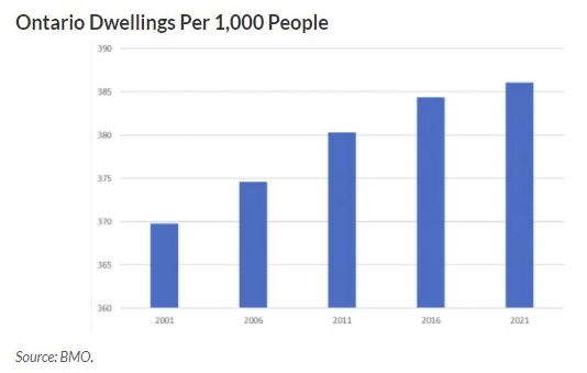 BMO发现,安省的住房存量在过去20年中的增长速度超过了人口增长速度。卡维奇说,事实上,自2001年以来的人口普查期间,安省人均住宅数量一直在稳步增加。