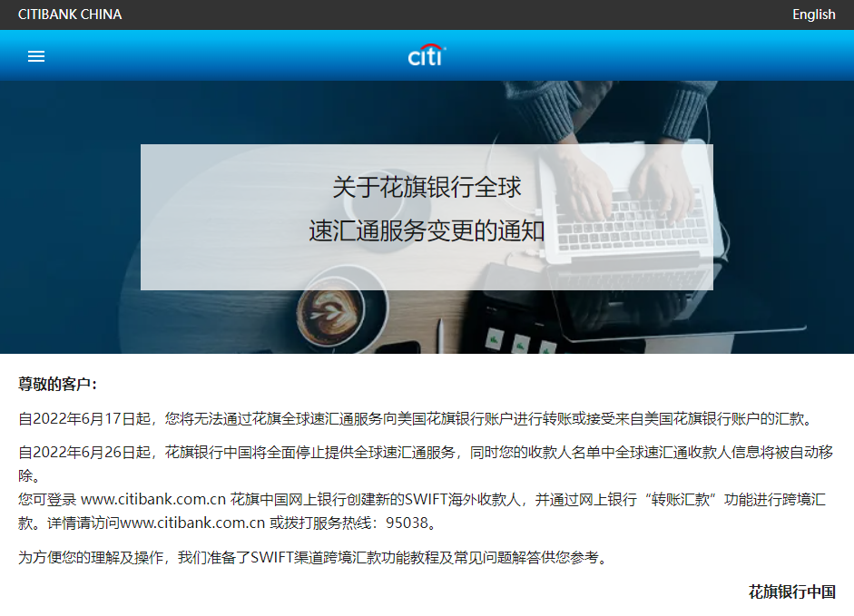 2、大名鼎鼎的花旗银行宣布自2022年6月26日起,花旗银行(中国)将全面停止提供全球速汇通服务,同时用户的收款人名单中全球速汇通收款人信息将被自动移除。