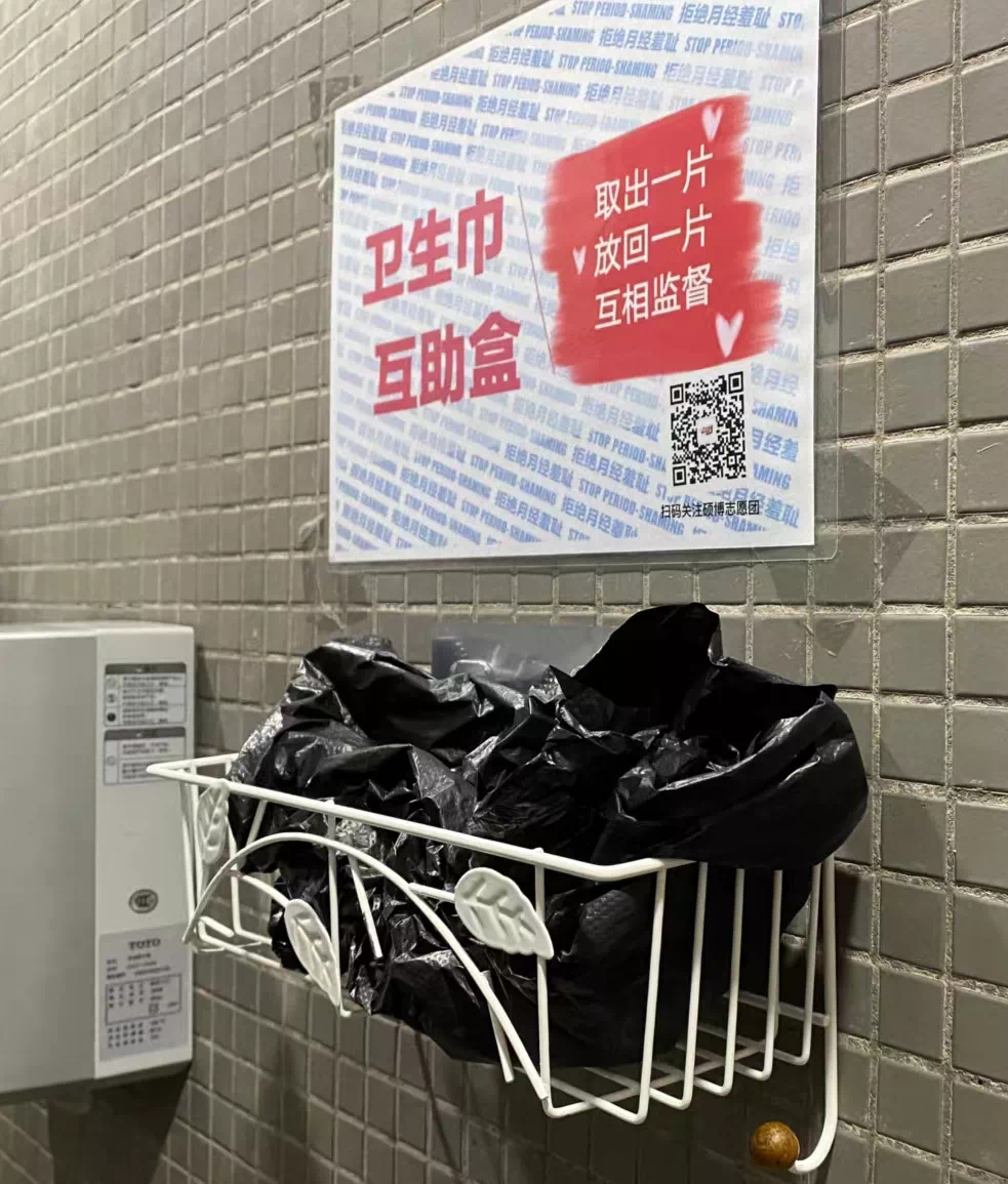 2020年11月1日,七个卫生巾互助盒被放进虹口校区图书馆、教学楼的女卫生间,互助小组还张贴了拒绝月经羞耻的宣传海报、每日检查表和强调“取一放一”原则的“互助盒使用公约”。
