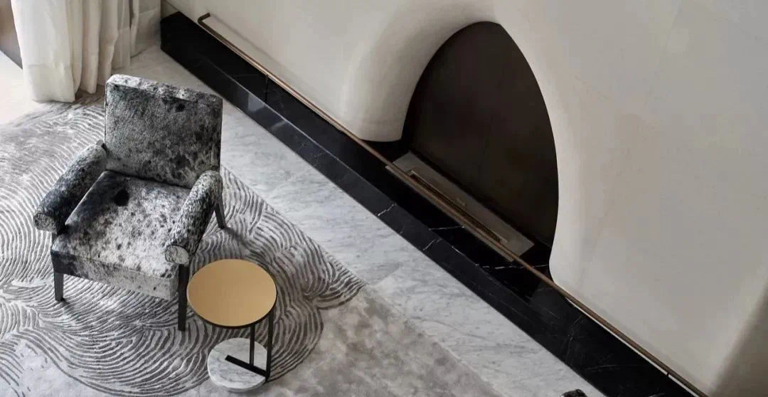 毛绒地毯上放置有造型质朴的石质茶几,极简的设计与周围家具明显不同,彼此互相烘托、对此,呈现出视觉上的碰撞,各式各样的肌理、形态都巧妙达成平衡,在适度的空间中透出冷静,而非不近人情。
