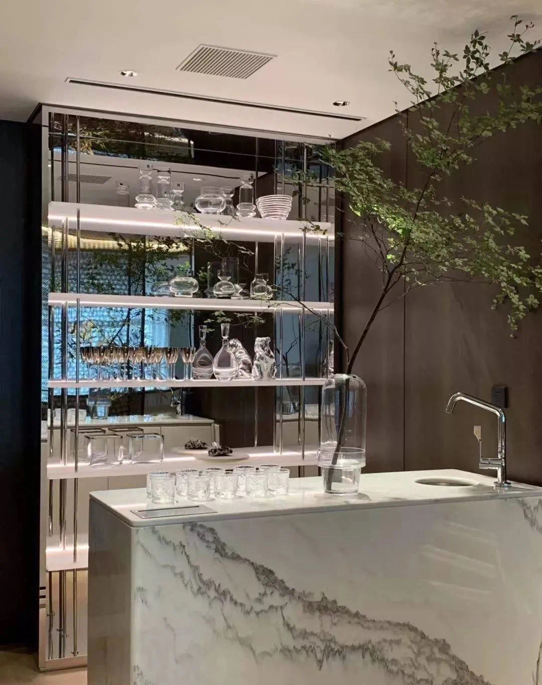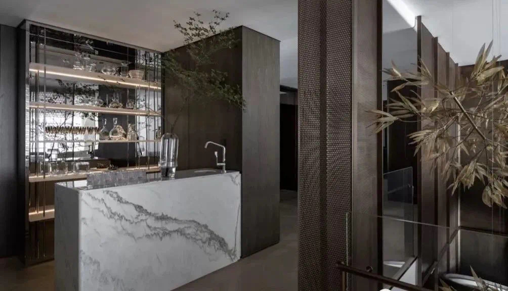 二楼楼梯口设有酒吧台,采用镜面设计拓宽整个视野,微小的角落也充分考虑,既灵活运用空间,又悄悄制造惊喜。