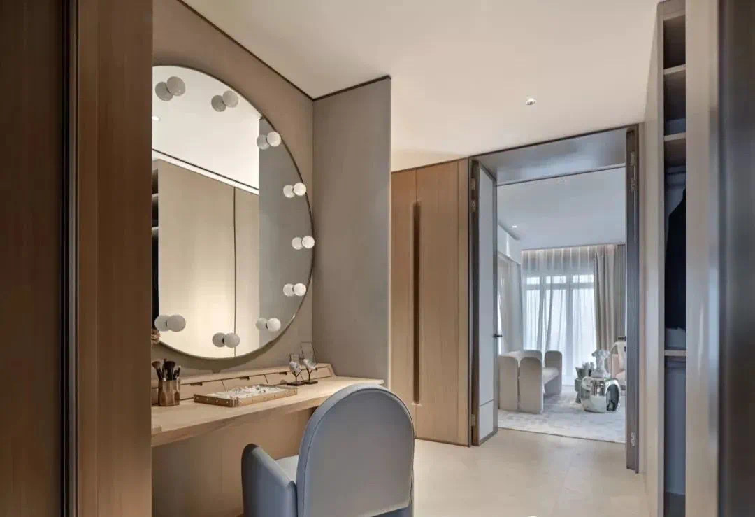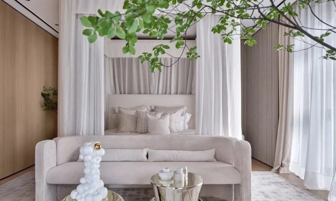 与公共区域的成熟风格不同,卧室更显柔情似水,采用原木、纱质等元素,将温柔细腻的情感注入空间。