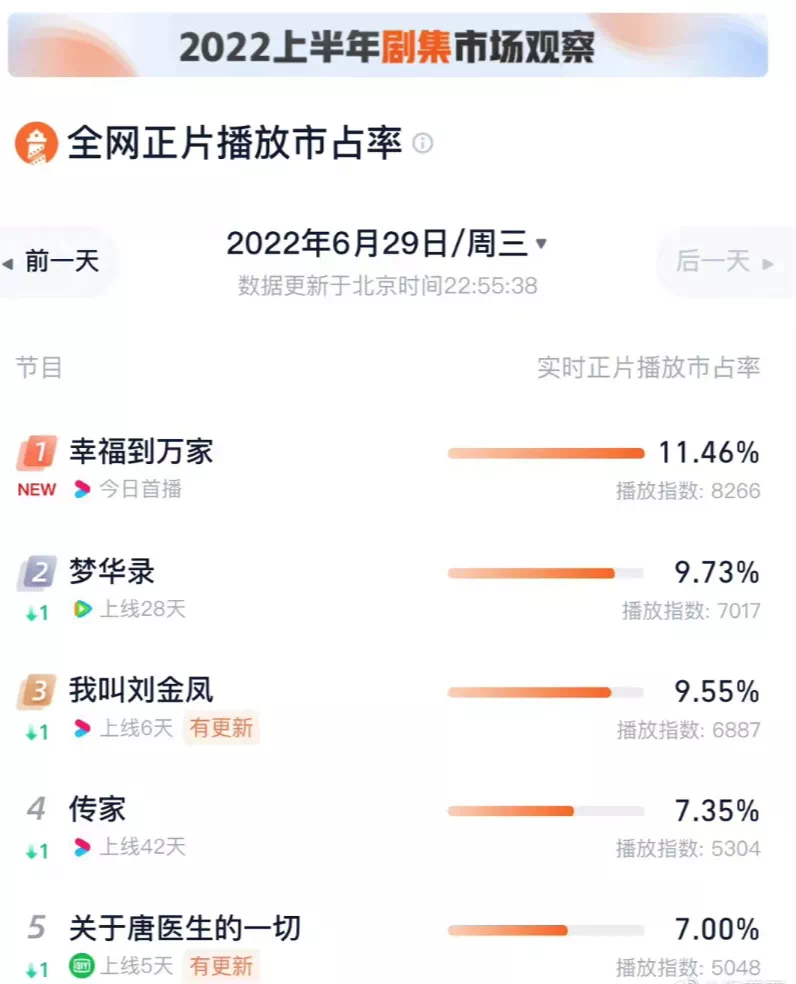 6月底《幸福到万家》开播,冷寂已久的影视圈又迎来爆款,刚开播热度登顶第一。