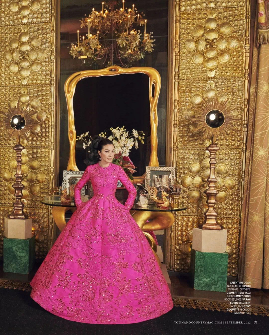 说的再简单点,把它当成 All Black 来穿即可。所以Pink PP需要放在黑色背景里拍才是正确的解题思路。饱经风霜、有岁月韵味的大女人也更能穿出Pink PP“粉即New Black”的磅礴气势。▲杨紫琼穿Pink PP登上Town & Country 杂志,杂志编辑很聪明地把镜面和地毯调成深黑色调来衬托这条粉色长裙。衣服上的珠绣细节也和背景里的金色浮雕相互辉映,粉色亦可成为一种气象。这可能也解释了为什么穿Valentino粉的年轻人那么多,只有郑秀文穿出了这个粉色的真髓?她演绎出了Valentino粉色的另一面——独立、个性、反叛和先锋,这些特质原本被时髦精们用来描述黑色。