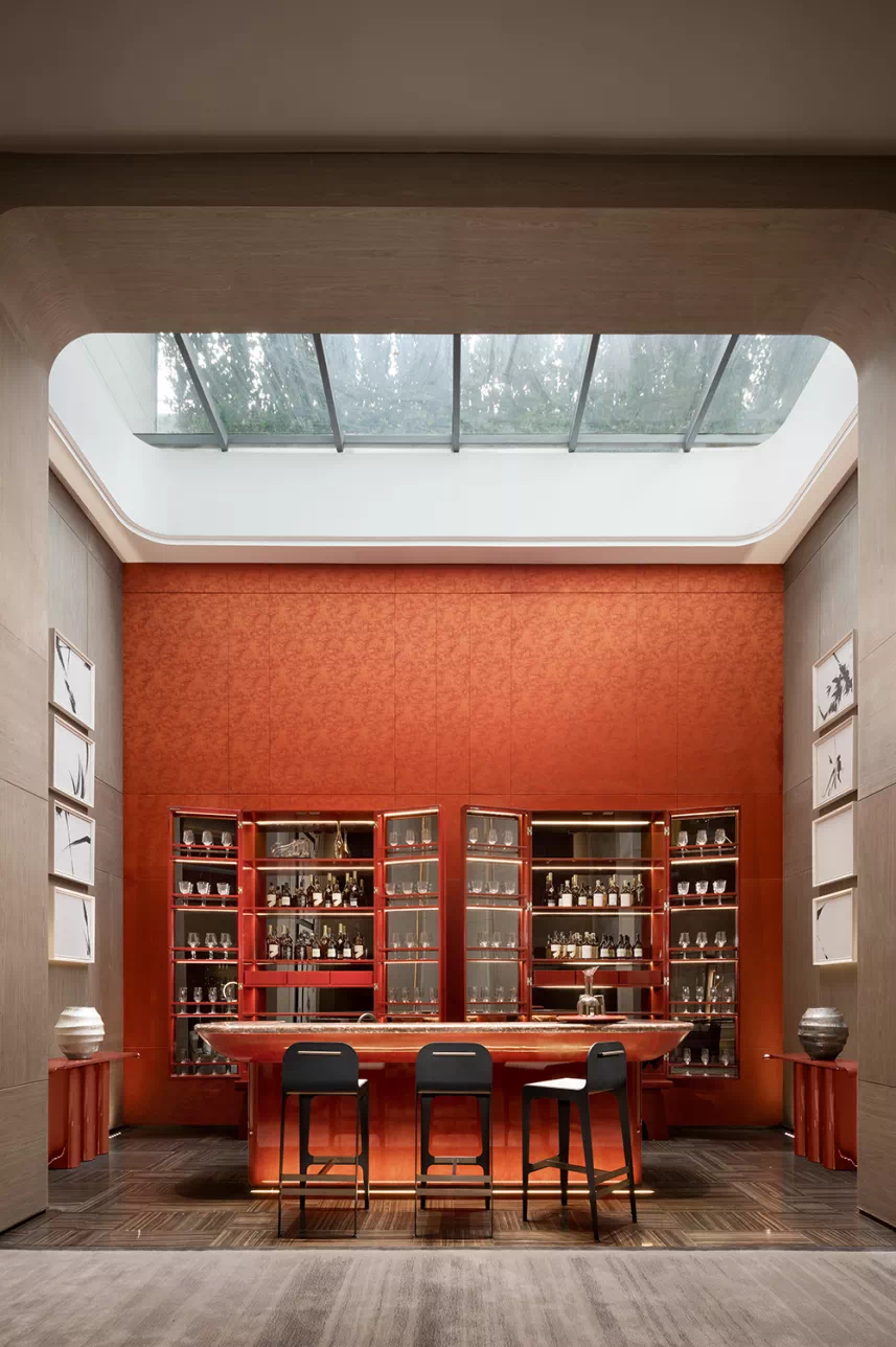 酒吧上方的天窗,为高度的红色提供一个释放的“出口”,外界的绿意借机蔓延进来,鲜活的芳香在室内无形地流淌,与酒香融合,悄然之间带进了几分野趣。