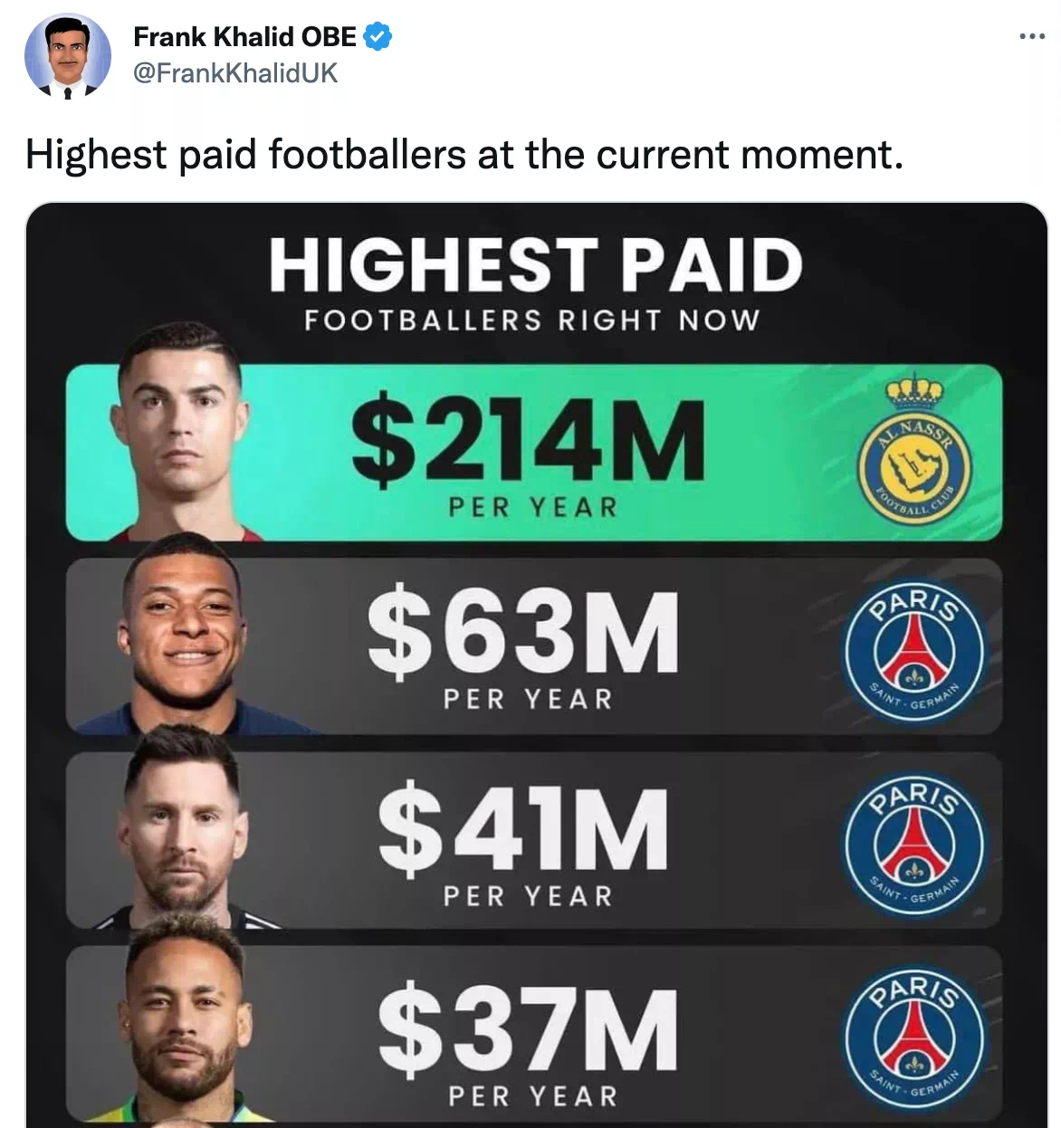 说回来哈,紧跟着C罗和梅西的人气的,是年轻一代的巴西球员内马尔,和这次在世界杯上出尽风头的法国球员姆巴佩。