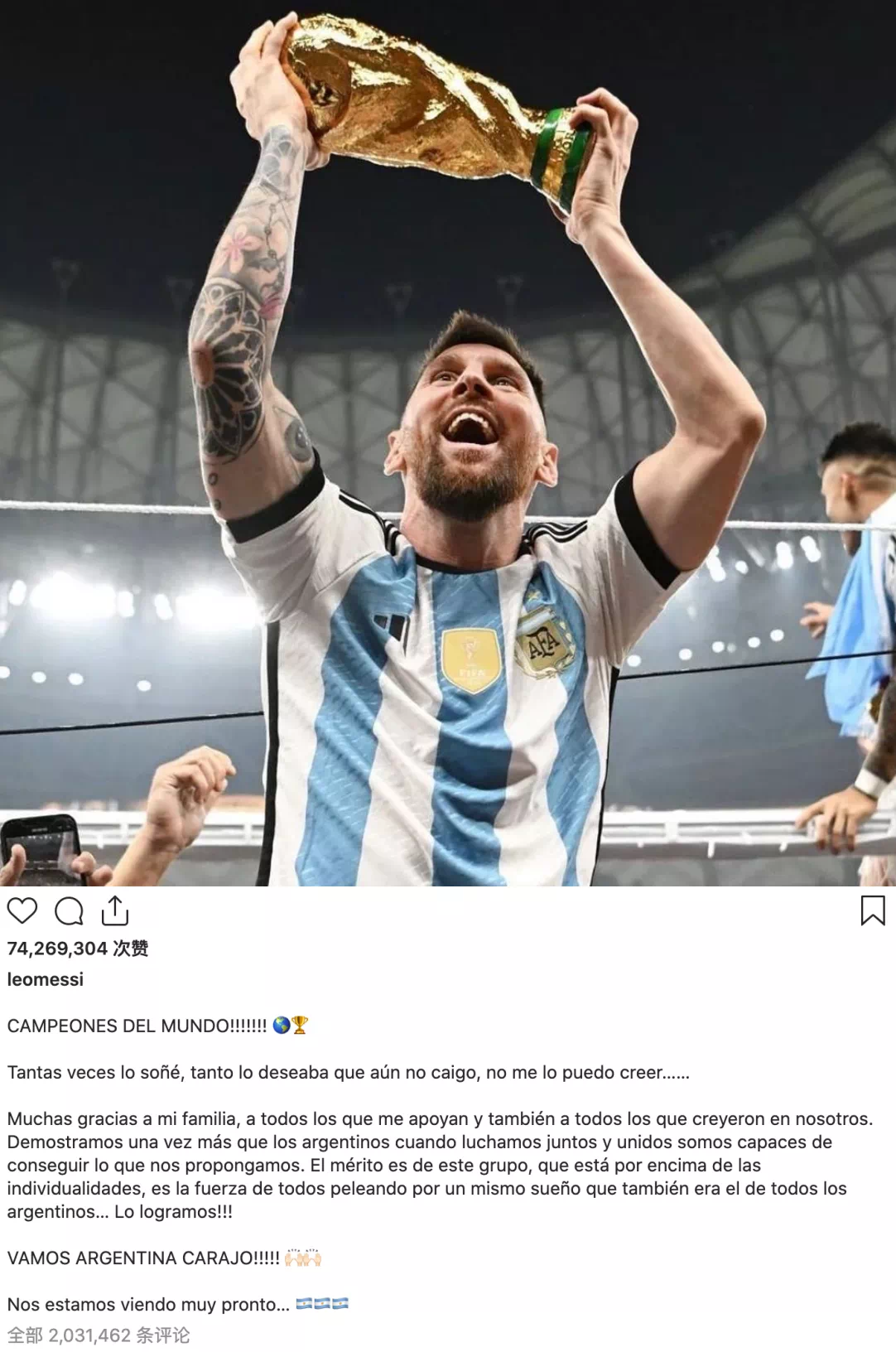 不过梅西这次还创了个很有意思的纪录,他世界杯冠军的帖子成为“史上点赞最多”的帖子,截至成稿时,获得了7426万次赞。