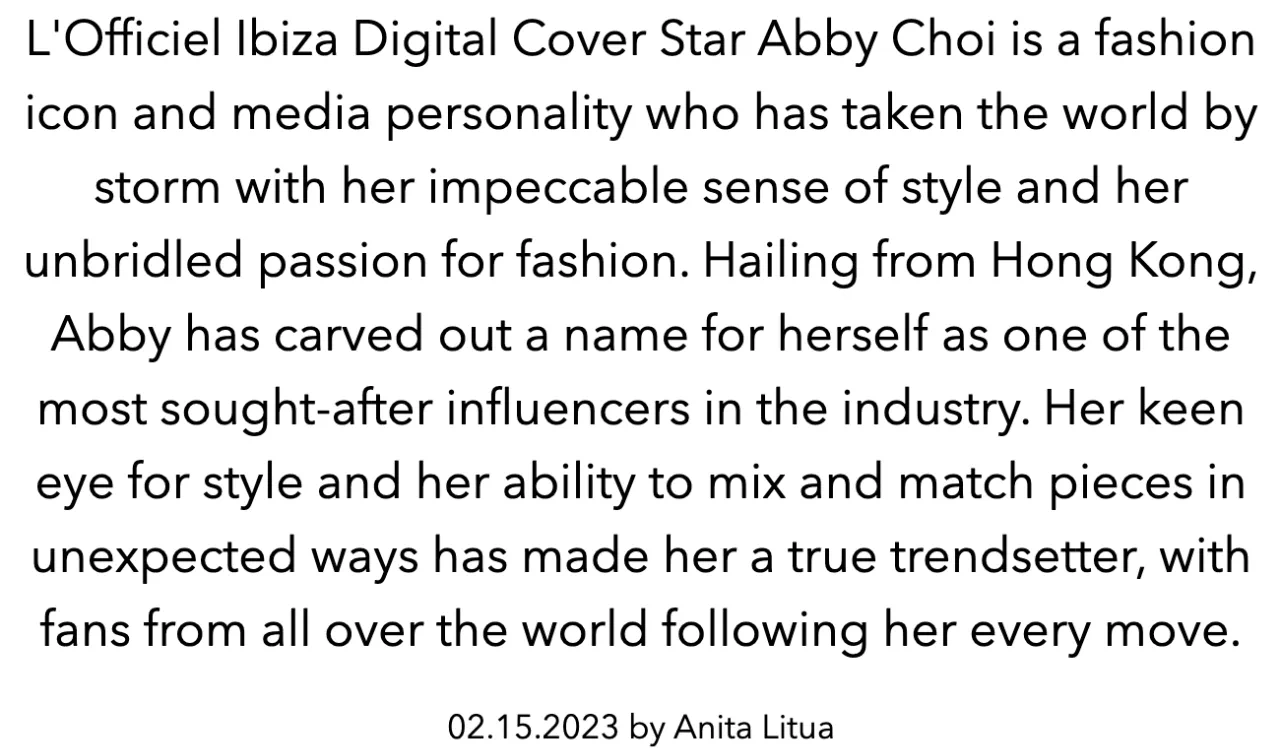 ▲ 还在当地进行了一期杂志的拍摄,是时装(L'Officiel)杂志的电子版。文章发布于本月15日,形容蔡天凤是时尚界冉冉上升的新秀,“以其对时尚无与伦比的触觉风靡全球”,丝毫不吝啬赞美和夸奖。