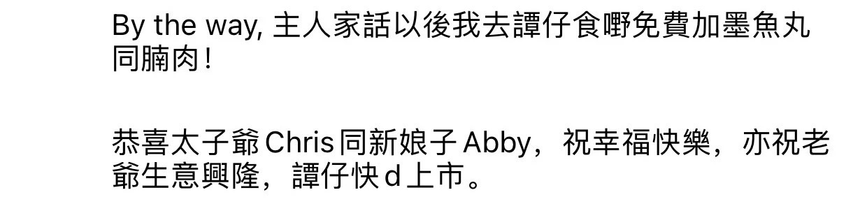原因二,她的婆家在城中算是有头有脸。她的丈夫Chris是在香港本地超级有名的谭仔云南米线的老板“五哥”谭泽均的独子: