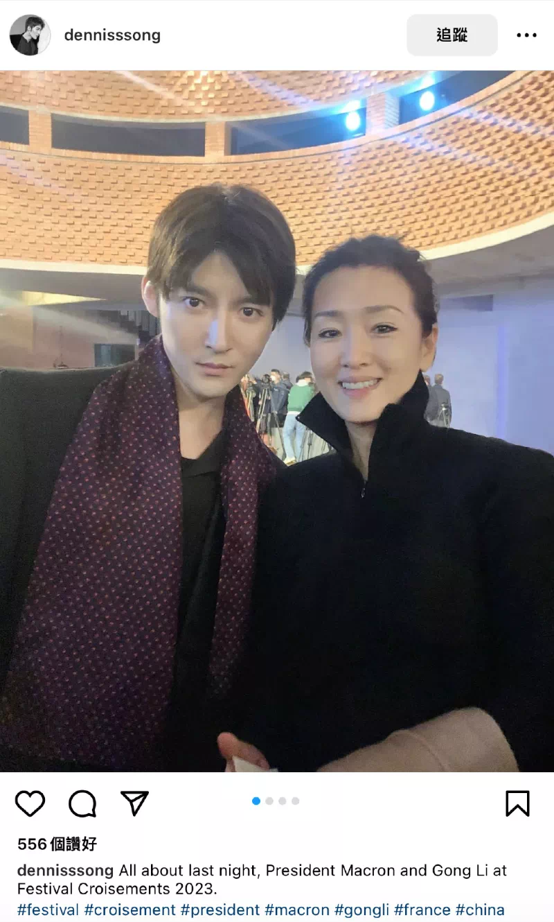 本次艺术节的开幕式主持人是大明星黄渤,黄渤也是展览的资助人之一,是“中法文化之春宣传大使”,黄渤以风趣幽默又不失优雅体面的表现,在社交媒体上刷屏。巩俐和丈夫坐在观众席里,一身黑衣,但气场夺目,人群中一眼能看得见她:▲左起:红砖美术馆执行董事曹梅及馆长闫士杰、中央美术学院院长范迪安、巩俐、艺术家严培明、艺术家沈远。沈远是黄永砅的遗孀。图源:凤凰艺术。正式的国宴,巩俐也参加了。也不断地有路人发布社交动态,晒出合影,看起来巩俐真的状态很好。▲除了艺术家们,马克龙还带着50多位大企业负责人来中国,包括LVMH总裁贝尔纳·阿尔诺,关于他家的故事,我们之前有写过。