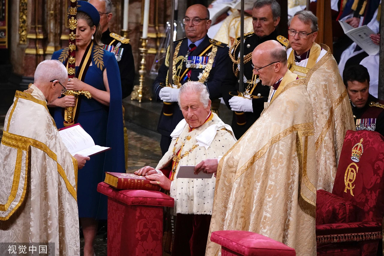 除了王冠,查尔斯还佩戴上了加冕仪式所需的君主之戒,同时被授予除王冠之外“权力三宝”中的另外两宝——王室宝球和君主权杖,手握全套留下历史性时刻的照片。